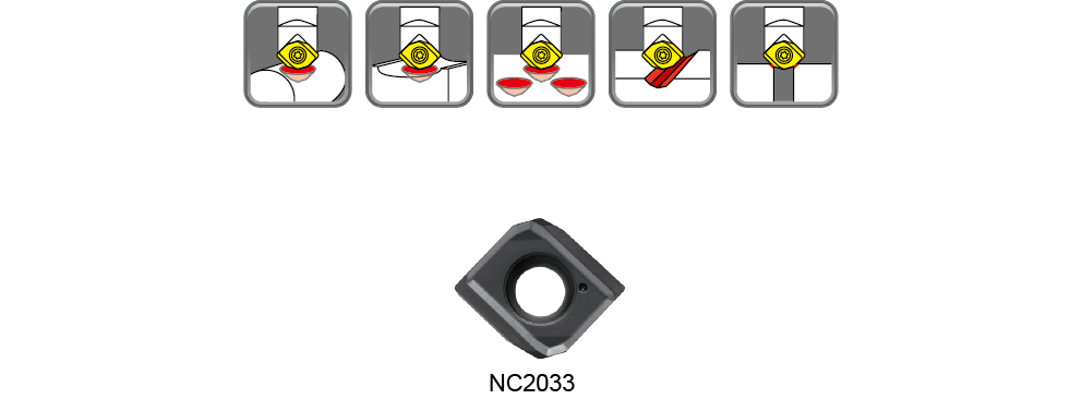 - NC2033 :• 刀片切削刃口研磨 • 泛用材種,適合鋼鐵,鑄鐵 •刀片有2個切削刃口