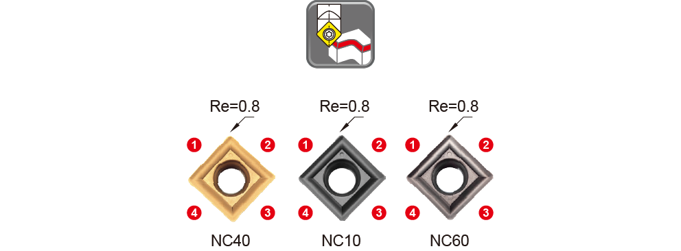 • NC40 :•泛用材種,適合鋼鐵,鑄鐵 • 刀片有4個切削刃口