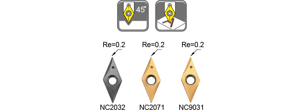 - NC2032 :• 刀片壽命長 • 泛用於鋼鐵HRC30 ~ 50,合金鋼,鑄鐵