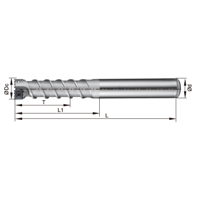 | Order No. | Part No. | Capable of drill dia. mm | ØDc | T | L1 | L | Ød | Max. Depth | Insert type | Max. ramping angle | |