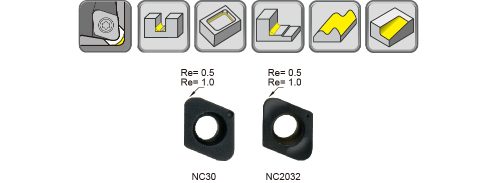 • NC30: •超微粒刀片,K10F底材,AlTiN鍍層 •正角刀片設計,泛用材質