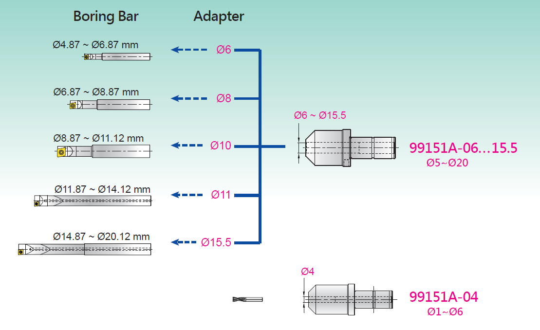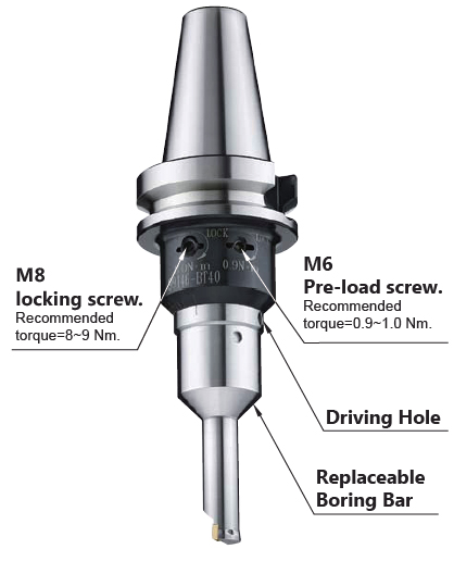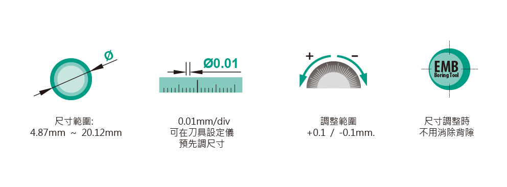 ● 尺寸調整容易,可在刀具設定儀預先調尺寸或在切削中心機上直接調整