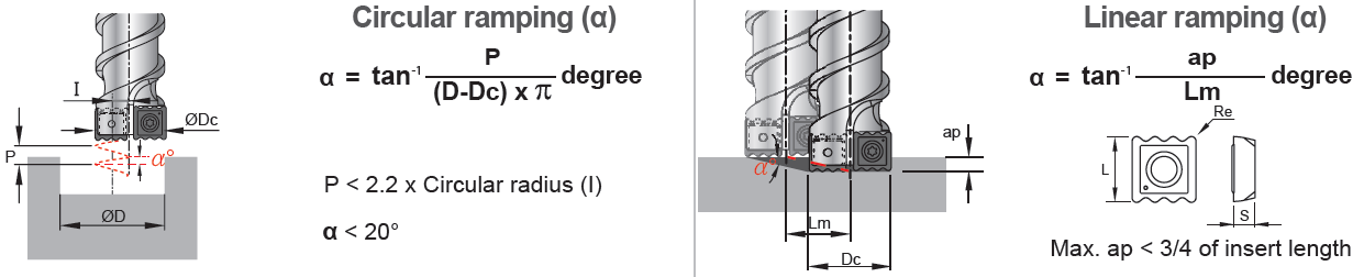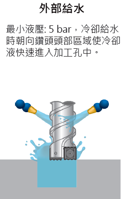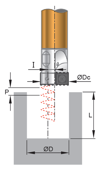 | Drilling diameter | Coolant type | Max. drilling depth | Tool type | Dc | Insert type | Re | Max. Ae |